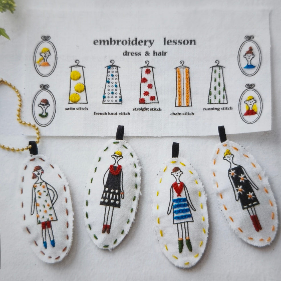 The concept of this design by Kazue Nakajima is that it can be stitched freestyle with your own favourite stitches. Create your own fabulous fashions, accessories and hairstyles using stitch, applique and embellishment - the choice is yours! Fabric paint, coloured pencils and pens can be used to add different skin tones and background colours. Each figure is about 5.5cm high.