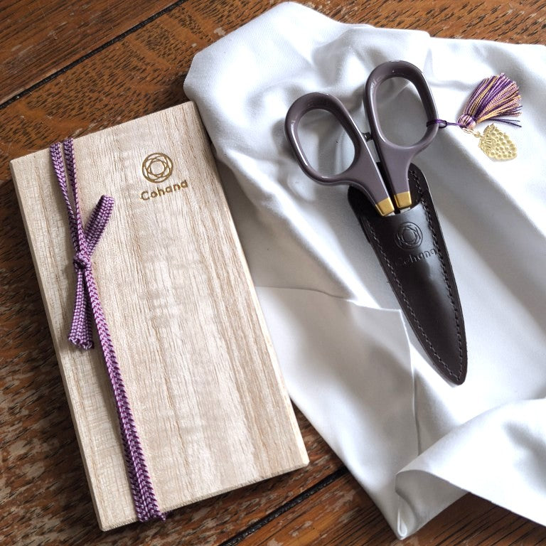 The soft dusky grey/purple handles are understated and classic, inspired by the colour of ripening grapes. Grapes have long been used in traditional motifs in Japan to represent prosperity and abundance. The scissors includes a brass grape charm and a purple and gold tassel.