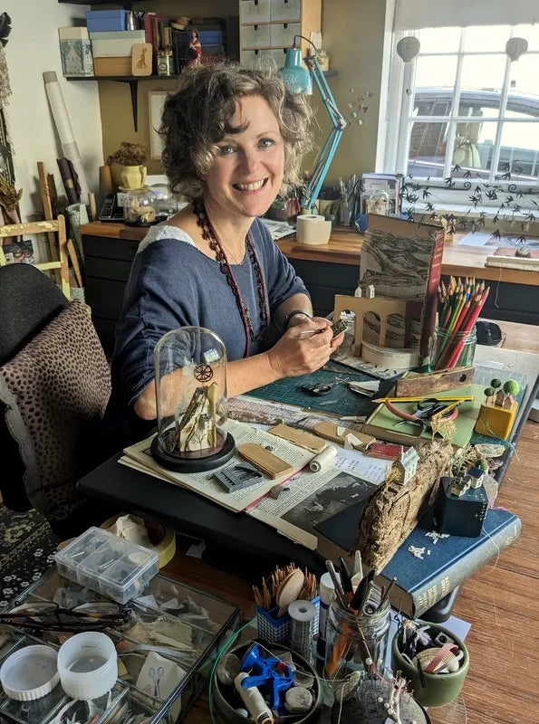 Presenting our first collection from Betty Pepper, Reel Lives are the most adorable paper sculptures.  Tiny paper houses teeter on their tiny platform of a vintage cotton reel - cosy and sweet but precariously positioned on the edge!  A fragile looking thread ladder leads to safety.