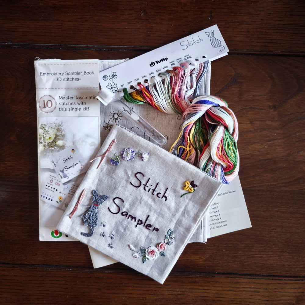 The kit makes up into a vintage style soft linen book, useful both as a "workbook" to practice stitches and also a "sample book" for experienced embroiderers who wish to create a stitch reference.  After stitching the pre-printed  length of fabric, you fold in the edges and concertina fold the fabric to create a beautiful linen stitch book.